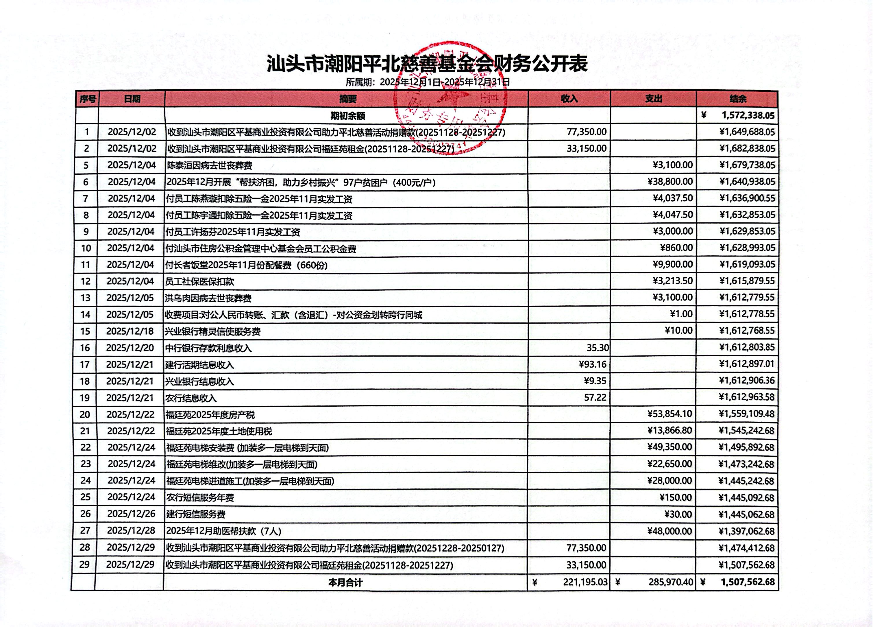 2025年12月1日至2025年12月31日财务收支明